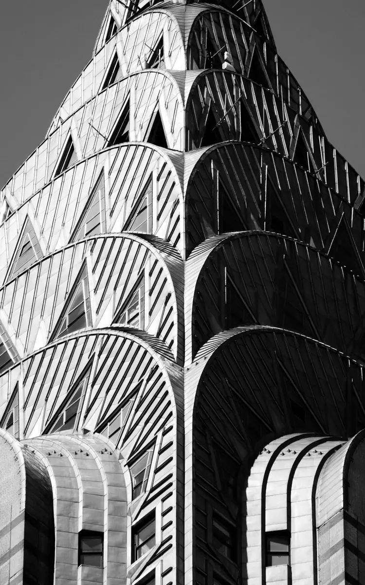 Art Deco crowns and setbacks, winter sun on limestone, hard edges at dusk. A Chrysler Building photo print where the crown carries the frame; an Empire State Building photo print that uses the grid as scaffolding; a Flatiron Building photo print that reads like a pencil line in space. These are black and white New York City prints built for legibility and scale.